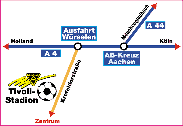 A4 Köln - Aachen, A44 Düsseldorf - Aachen oder aus Belgien E40 (Belgische A3) Lüttich - Aachen, immmer bis Autobahnkreuz Aachen, dann Richtung Niederlande (Antwerpen / Heerlen) A4 (E314), 1. Ausfahrt Aachen-Zentrum/Würselen abfahren, rechts auf die Krefelder Str., nach ca. 2,5 km liegt das Stadion auf der rechten Seite. Gute Parkmöglichkeit vorher auf der rechten Seite am Reitturnierstadion/Eishalle. Fußweg von da ca. 5 Minuten. Zum Stadion fährt man mit der Linie 51 direkt bis vor den Haupteingang. Ab Bushof setzt die ASEAG bei Heimspielen Sonderbusse ein, die alle 10 Minuten abfahren. Vom Hauptbahnhof fahren die Linien 1, 11, 14, 21, 46, 56, 163 zum Bushof. Man fährt bis Aachen Hauptbahnhof und setzt sich anschließend in den Bus (s.o.) oder nimmt eine der zahlreichen Taxen. Die Sonderzüge der Fans fahren meistens bis zum West-Bahnhof. Von dort geht man ca. 30 Minuten zu Fuß zum Stadion, natürlich nicht ohne Begleitung der Ordnungshüter, die einen am Bahnhof erwarten.