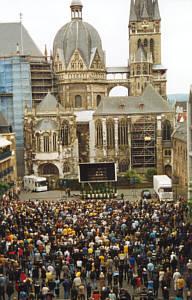 Mehrere Tausend Menschen verfolgten auf dem Katschhof auf einer Videoleinwand den Gottesdienst im Dom. Foto: Harald Krömer | ||