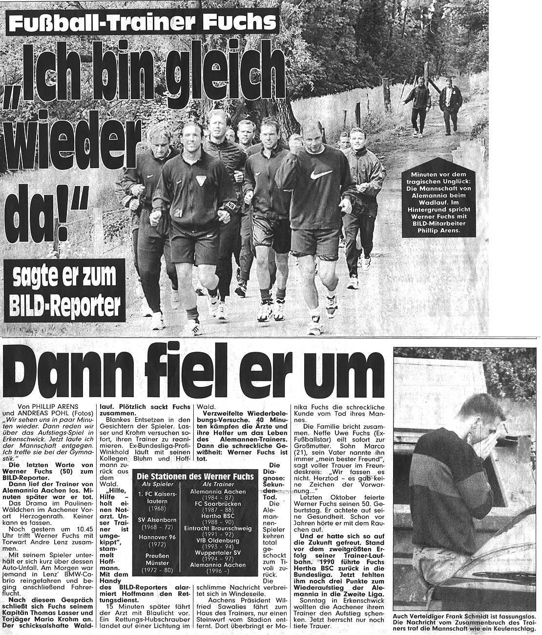 Trainer Werner Fuchs ist tot. Unser Cheftrainer erlitt heute morgen während eines Waldlaufes mit seiner Mannschaft einen Herzinfarkt. Die Reanimierungsversuche blieben erfolglos. Für Medienvertreter findet um 16.30 Uhr eine Pressekonferenz im VIP-Raum am Tivoli statt. Die Alemannia bitten schon jetzt, von Anrufen oder Besuchen bei Funktionsträgern der Alemannia, insbesondere aber auch bei Familie Fuchs abzusehen.